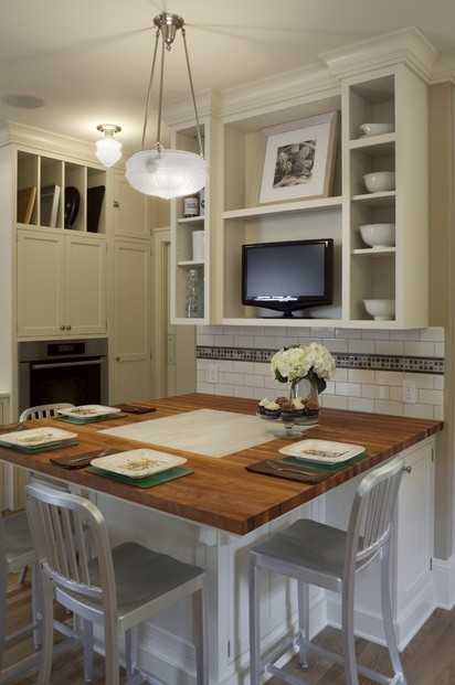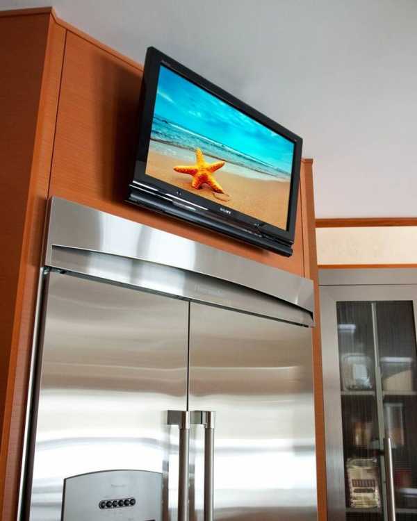 Можно просто подобрать телевизор по размерам открытой полки в гарнитуре или при заказе кухни попросить у мастеров изготовить специальное место в шкафчике под телевизор.