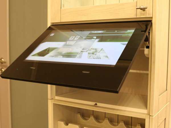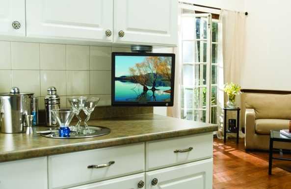 - откидной телевизор – крепится под навесным кухонным шкафом, в сложенном состоянии почти не заметен. Поворотный кронштейн позволяет развернуть его для комфортного просмотра