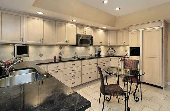 - Обои светлые, пол светлый, так как на кухне много мебели, и освобождать пространство нужно за счет самых светлых цветов;