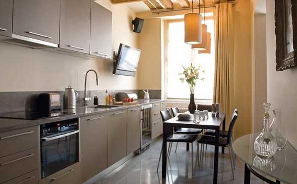 Если гарнитур длинный, то места хватит не только для всей необходимой бытовой техники, но и для телевизора.