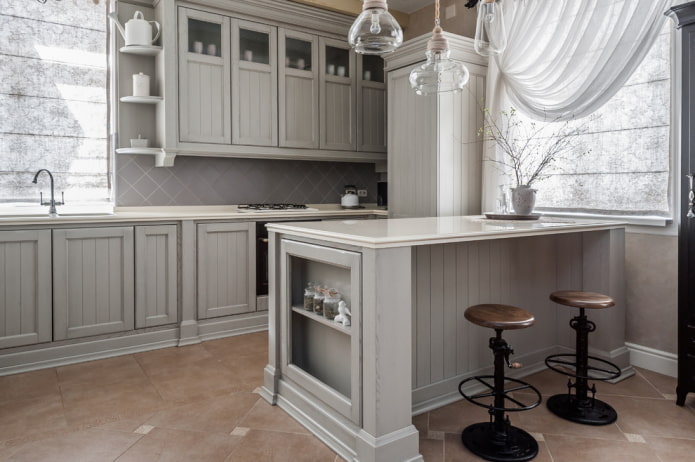 Светло-серые и песочные тона в дизайне кухни в стиле прованс на фото напоминают о средиземноморских пляжах и делают интерьер уютным. Такая цветовая гамма хорошо сочетается с элементами из светлого дерева и традиционной для прованса глиняной посудой.