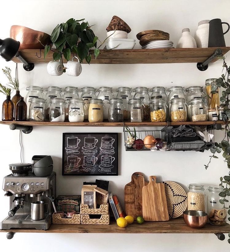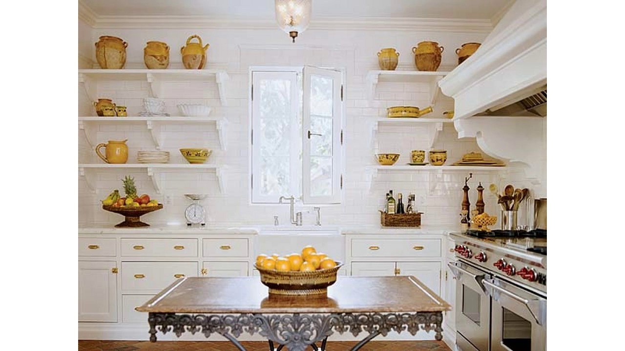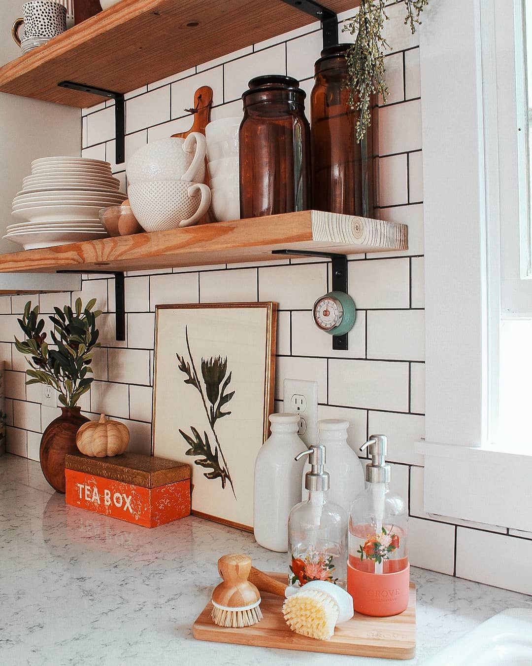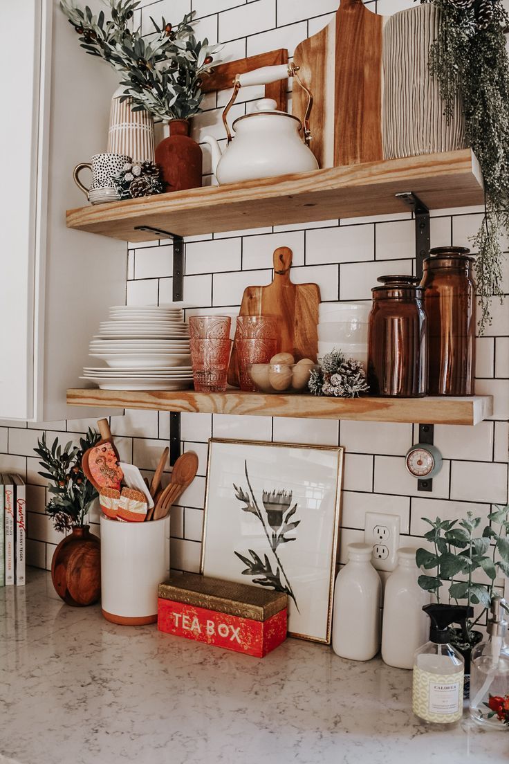 16.Эта белоснежная кухня приобретает осенний вид с уютной палитрой выжженного оранжевого и зеленого. Нам нравится, как все открытые стеллажи дают много возможностей для демонстрации сезонных фаворитов. (через @kozycolonialhome)