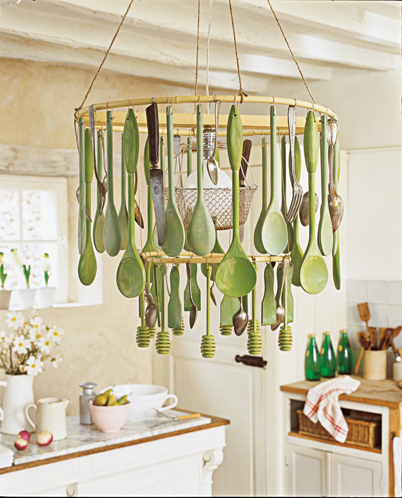 Плафоны и абажуры можно сделать из самой разной кухонной утвари, закрепив её на каркасе старой люстры: