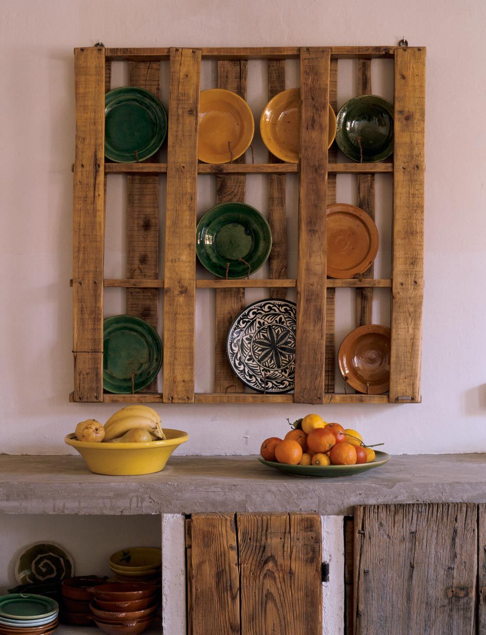 27. Деревенский деревянный многоуровневый поднос служит центральным элементом этого кухонного острова. Поднос наполнен глиняной посудой ручной работы Рэя Данна с искусственными хлопковыми спреями, листьями и листвой.