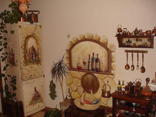 Роспись. Если вы профессионал в художественном искусстве или готовы заплатить за эффектный рисунок на стене, роспись – это еще один отличный вариант разнообразить кухонный интерьер живописной ноткой. Обилие сюжетов позволяет подобрать оптимальный стиль и создать в помещении атмосферу Италии, наполнить его очаровательным видом на бескрайние природные красоты или превратить в роскошную террасу на побережье.