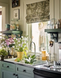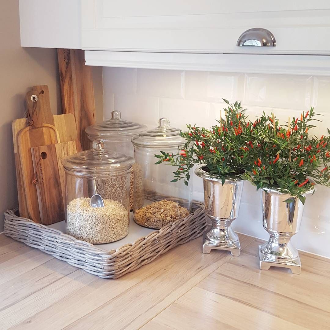 Стоит подумать и об украшении кухонной столешницы, особенно если она широкая. На ней будут красиво смотреться графины и лимонадники для летних напитков из прозрачного или цветного стекла, различные фигурные банки для сыпучих продуктов с крышками, изысканные фарфоровые конфетницы, вазы для фруктов.