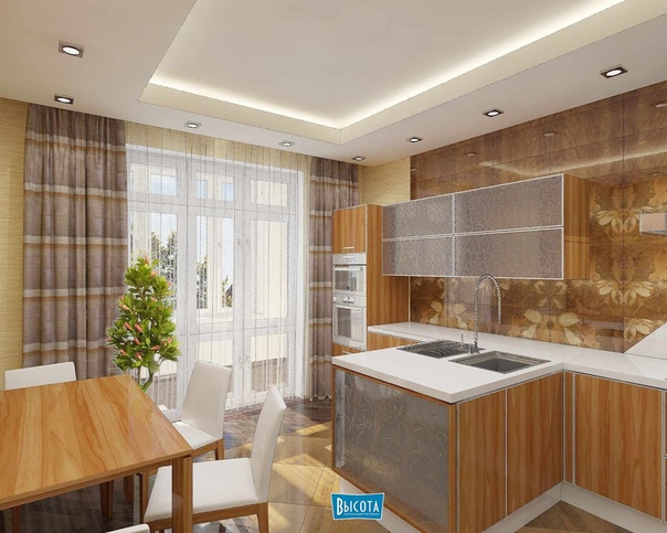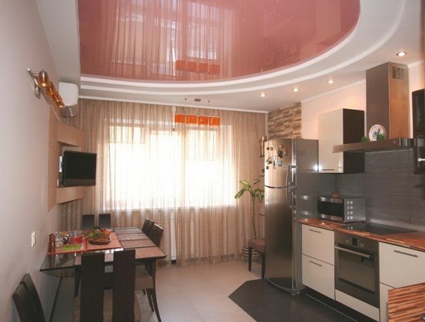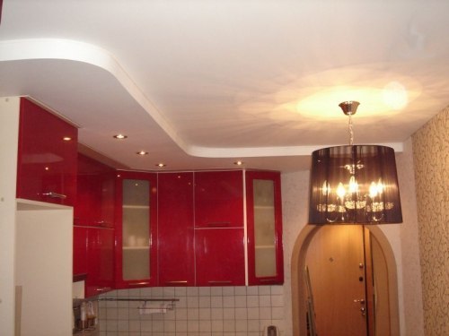Двухуровневый потолок прямоугольной формы может квадратную кухню сделать более продолговатой.