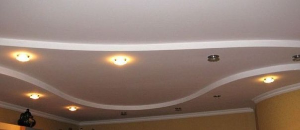 Сложные фигурные каркасы хорошо применять в больших помещениях, где несколько уровней навесного потолка не отнимут много свободного пространства. Гипсокартон легко режется по кривой, но для монтажа прочных изогнутых фигур необходимы жесткие металлопрофили. Фигурный каркас может не только снизить высоту в комнате, но и визуально увеличить отдельную зону в помещении, если потолок над ней имеет углубление, т.е. более высокий уровень.