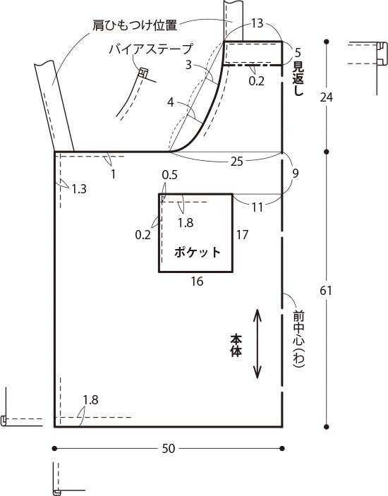 - Прикладываем бейку (или заготовку из полоски) к боковинам фартука, оставив нужную длину на завязки сверху и сбоку. Стачать на машинке.