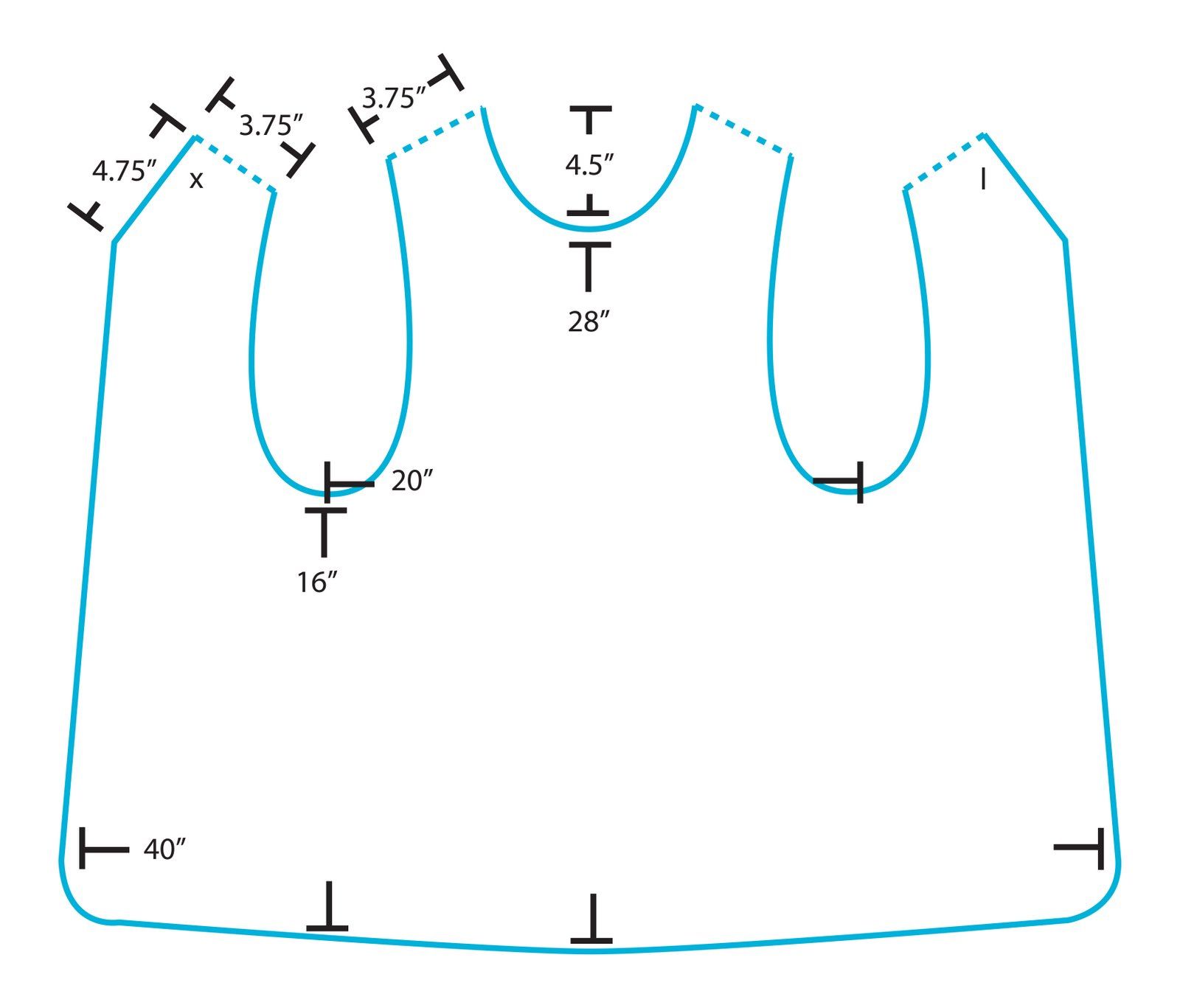 Следующий кусок диагональной ленты, который я прикрепил, имел длину 85 дюймов. Прикрепите косую бейку, как показано на рисунке ниже, чтобы для отверстия на шее оставалось 19 дюймов.