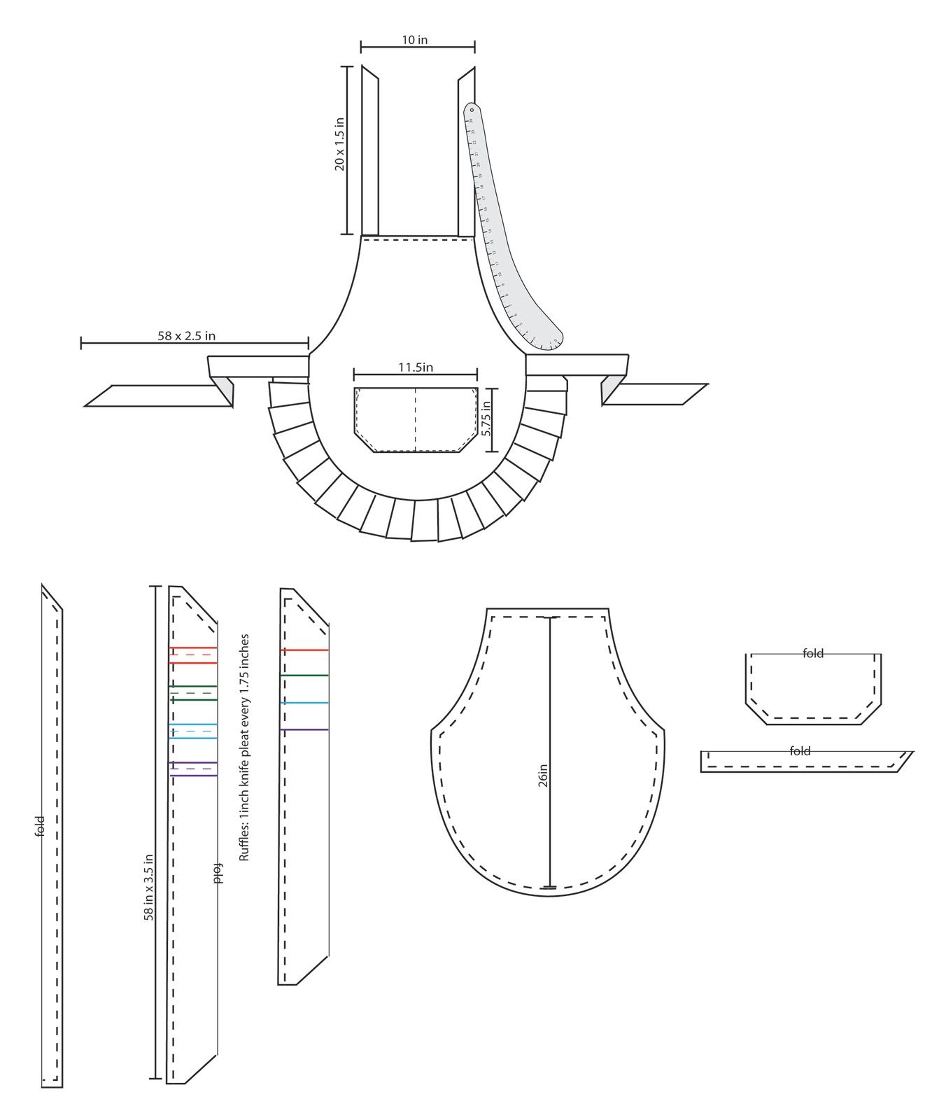 Чтобы прикрепить их к фартуку, приколите концы ленты к задней части фартука, чтобы получился ремешок на шее и завязки.
