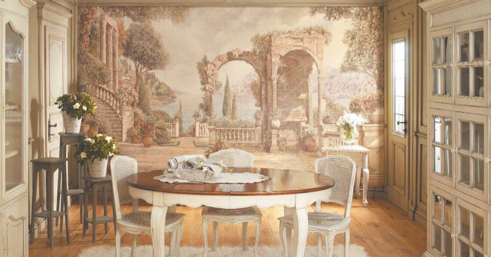 Изысканная фреска на стену для кухни в стиле кантри, рустик, любом деревенском привнесет уют и тепло в ваш дом. Самое время выбрать грубую каменную кладку, шершавую штукатурку вместе с пастельной палитрой, нежными цветами. В такой способ можно стилизовать интерьеры в стиле shabby-chic, прованс. Обязательно используйте фрески с пасторальными мотивами, элементами европейской архитектуры, венецианского искусства.