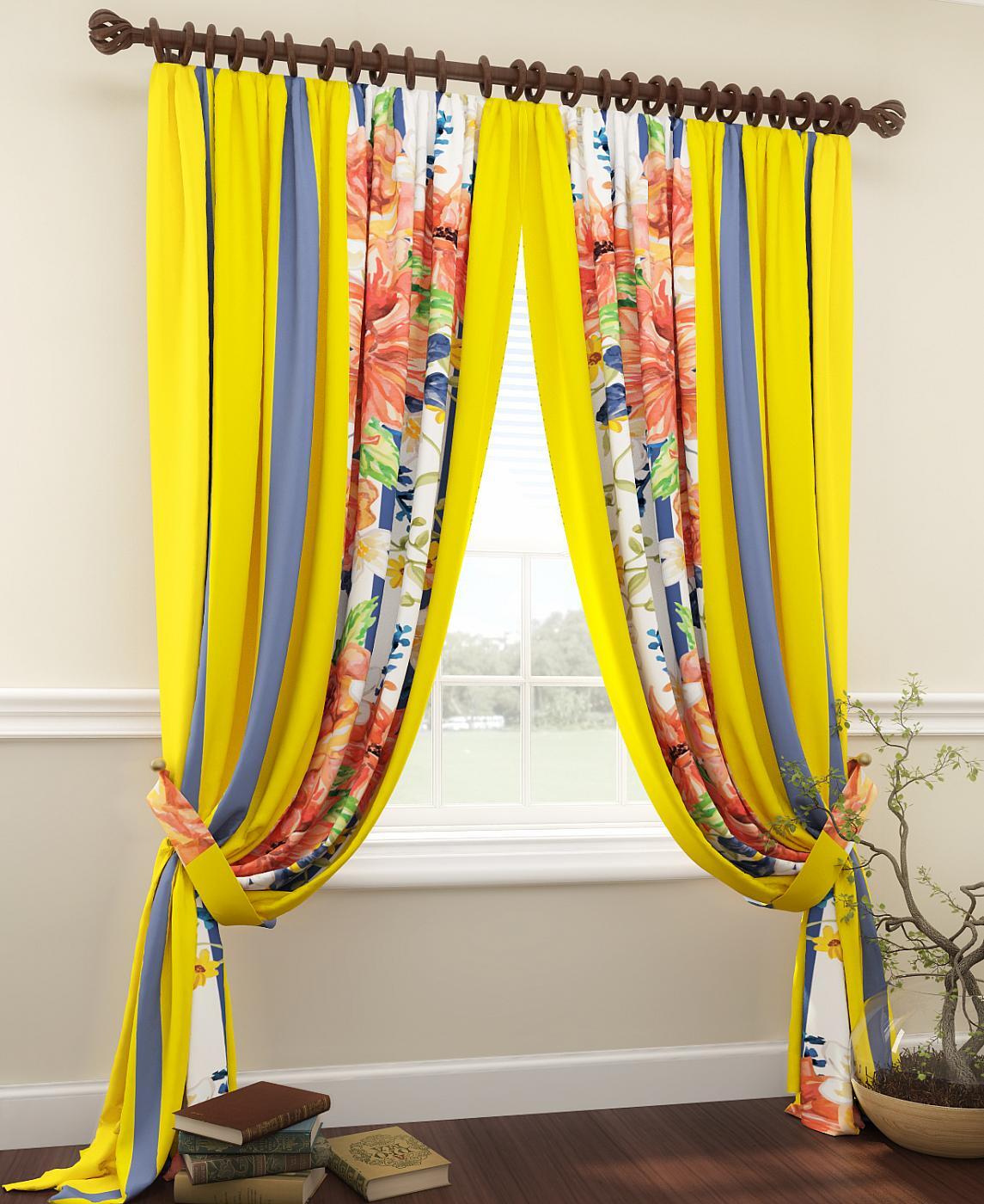 Романтично и свежо выглядят комбинации, когда сразу у окна размещается белый тюль, потом идут шторы с горчичным принтом, а после — однотонные портьеры в цвет узора.