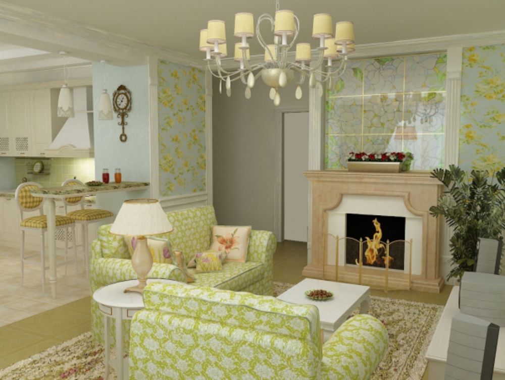 Идеальным украшением помещения, оформленного в прованском стиле, станет камин. Он создаст в комнате максимальный комфорт, атмосферу уюта. Выберите для такого помещения люстру с деревянными, керамическими, коваными элементами.