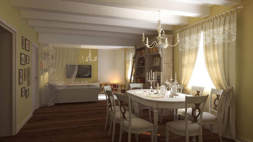совмещенная планировка уютной комнаты и ее дизайн, интерьер в прованском стиле