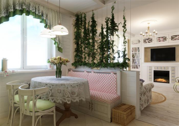 В процессе разработки проекта дизайна кухни, столовой и гостиной, объединённых вместе в стиле прованс, необходимо определиться с типом границы, отделяющую каждую из зон. При этом разделённые зоны должны представлять собой единую целостную композицию.