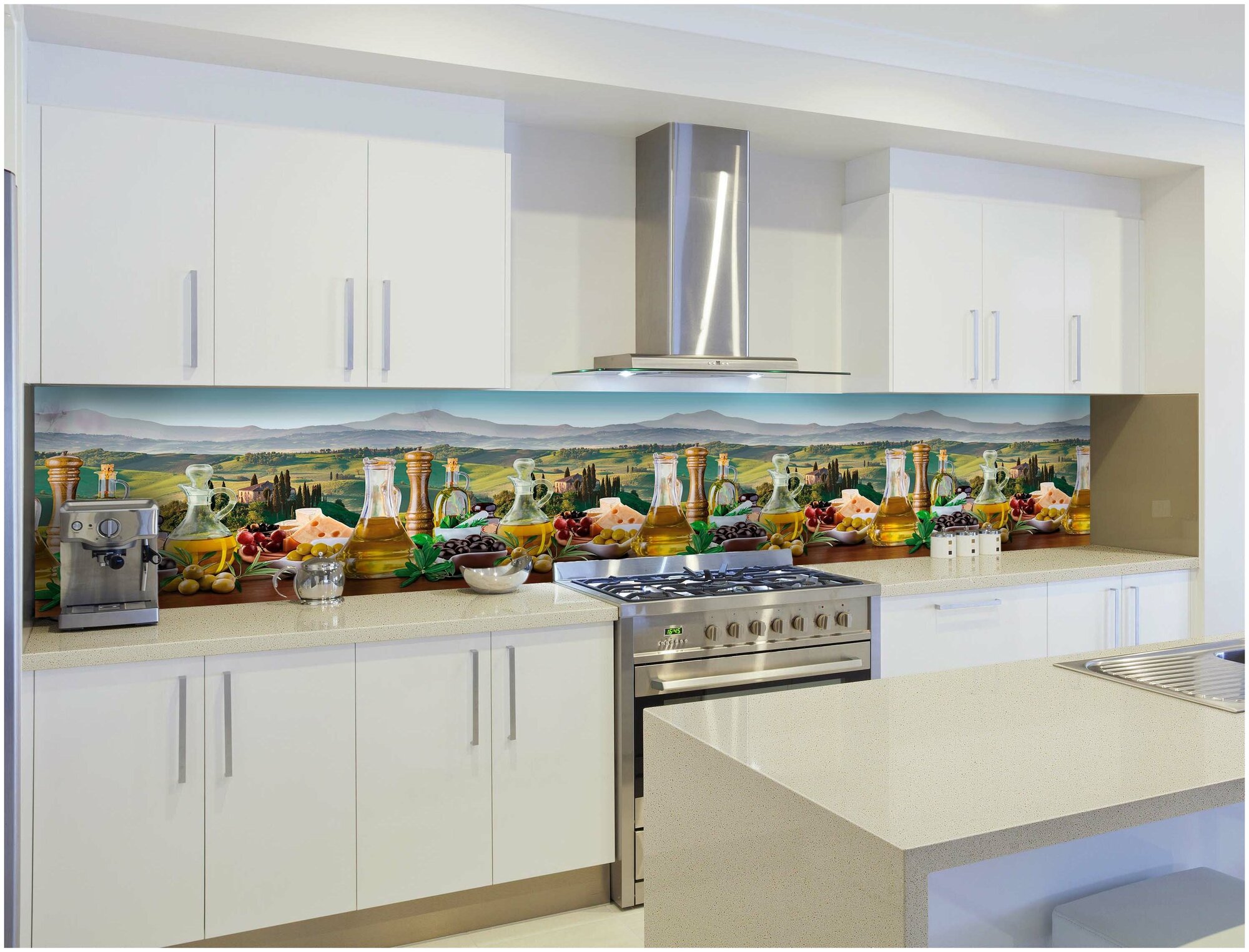 Такой фартук легко мыть, он не тускнеет и не боится химического воздействия и перепадов температуры вблизи открытого пламени. Стекло для кухонного фартука можно вырезать под заказ.