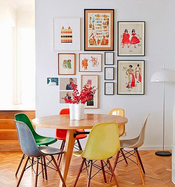 - Существует много вариантов применения данного метода декора. Например, на следующем фото традиционные портреты и натюрморты заменены современными плакатами разных культурных событий, книжными илюстрациями,