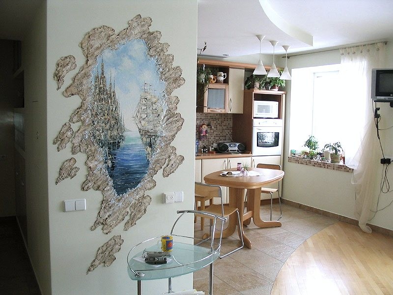 Декоративная штукатурка даёт возможность сделать дизайн уникальным и индивидуальным, отразив вкус и предпочтения хозяина квартиры. Такой вид облицовки очень востребован и популярен, поскольку даёт возможность создать нечто уникальное и непохожее ни на что больше, выразить свой собственный полёт фантазии. Кроме того, на штукатурном покрытии можно делать роспись. Для этого лучше пригласить художника или сделать роспись самому. Также с выступами на стенах с красивой штукатуркой отлично будет смотреться панно, сделанное своими руками или приобретённое в магазине.
