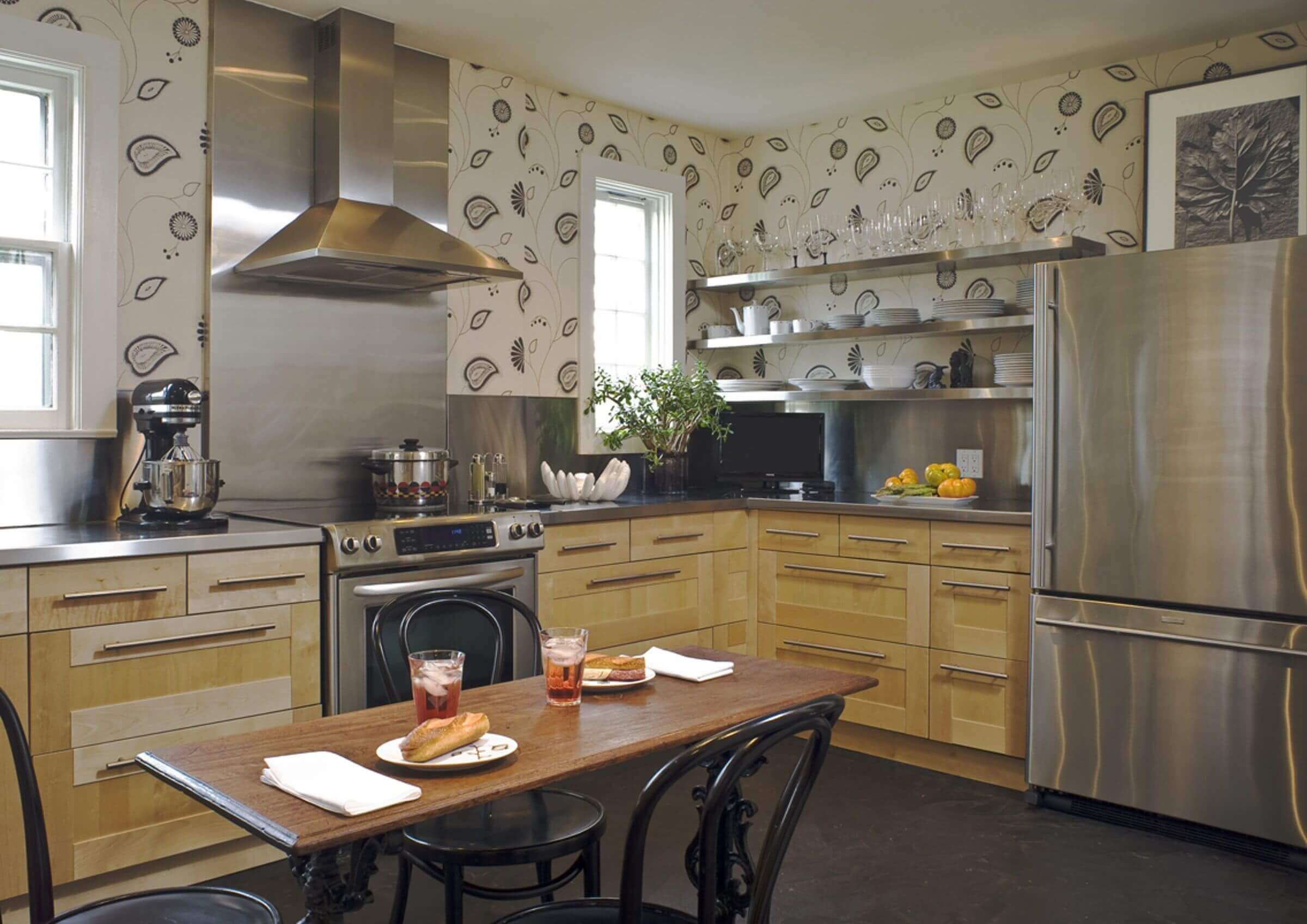При выборе рисунков обоев важно помнить о других элементах кухни.Хороший способ для этого — создать доску настроения, которая включает изображения ваших шкафов, столешниц, осветительных приборов, полов и мебели.