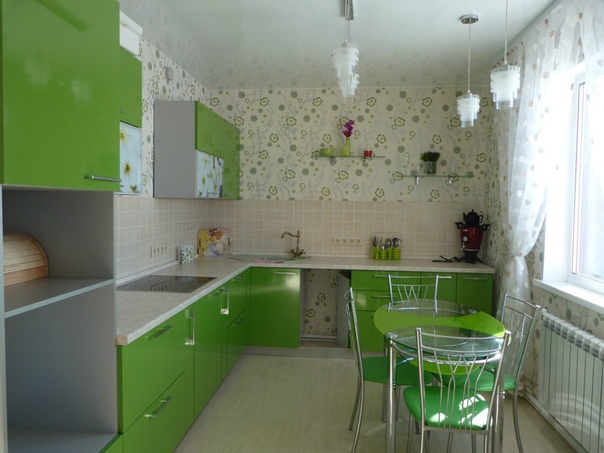 Ядовито-зеленое настенное покрытие уже не используют на кухне. На смену ему пришли “выцветшие” оттенки (например, желто-зеленый, светло-салатовый). Они хорошо сочетаются с холодной и теплой палитрой (серым, терракотовым, белым, сиреневым цветом).