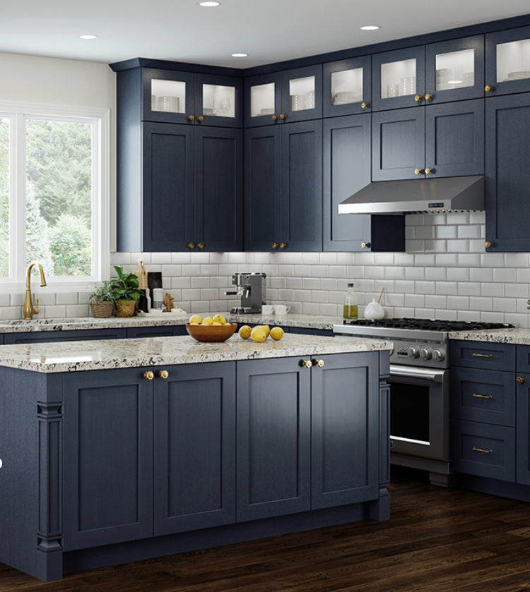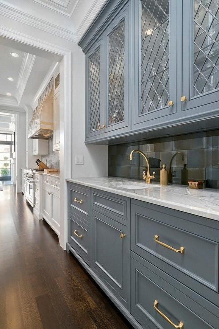 Для классической кухни серого цвета можно приобрести гарнитур насыщенного синего оттенка. Он будет смотреться очень добротно и благородно, а излишнюю драматичность интерьера советуем разбавить натуральными материалами и белыми акцентными деталями.