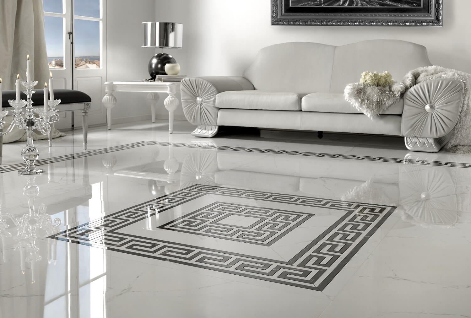 Светлые оттенки зрительно увеличат пространство, глянец плитки добавит сияния и освещенности. Рисунок для гостиной подбирают наиболее парадный и представительный, добавляя в отделку золотых элементов.