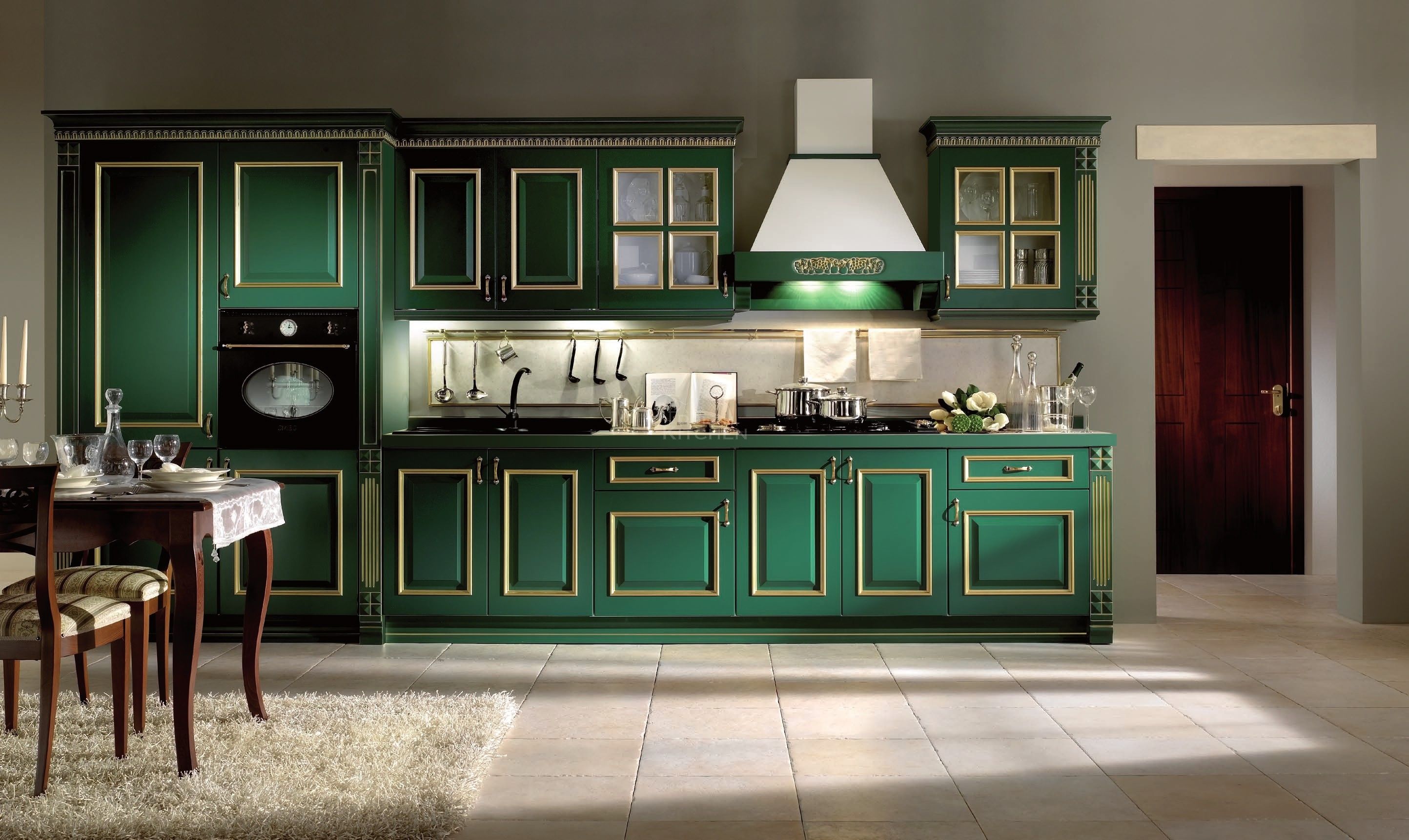 Зеленый в классическом стиле обязан быть благородным и насыщенным. Это может быть столешница под мрамор или ручки на фасадах с зелеными вставками. Отделка фартука кафелем или фотопанелью с изображением зеленых вензелей — вариантов много. Одно остается неизменным — элегантность и утонченность классического стиля.