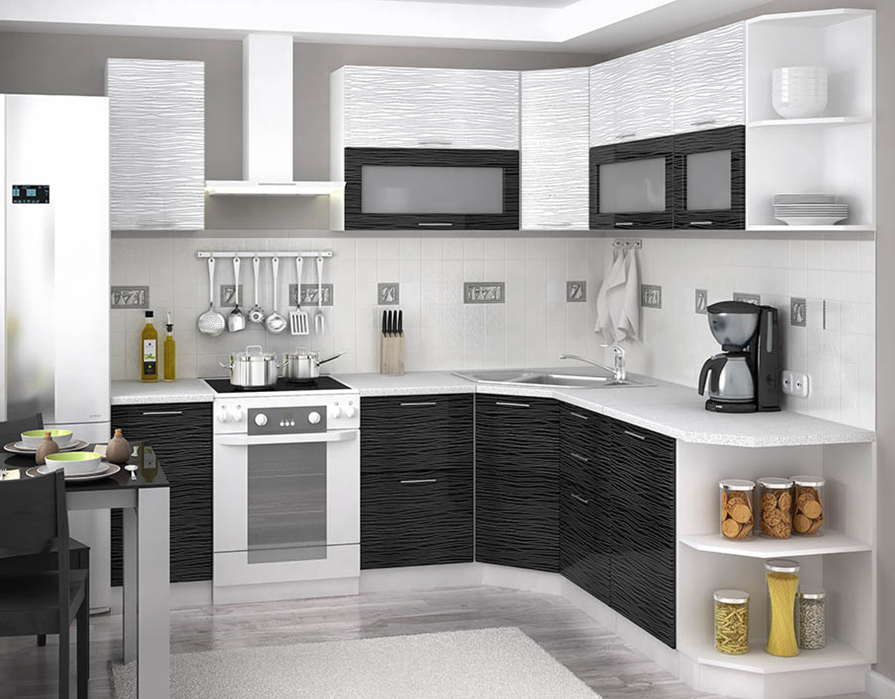 Более доступным вариантом гарнитуров в черно-белом цвете являются фасады, которые покрывают ПВХ-пленкой либо же пластиком.
