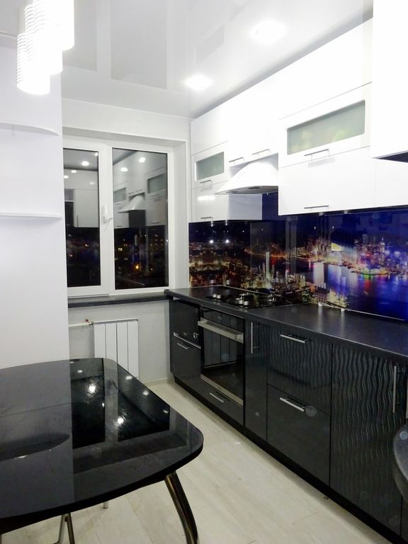 Идею можно воплотить в жизнь при любом цвете столешницы и самого гарнитура, поскольку стена будет выложена двумя цветами в виде мозаики. Кроме того, в данном варианте допускается использование дополнительных элементов из стекла либо керамической плитки с узором. В такой цветовой гамме фартук удастся оформить фотопечатью, где может присутствовать изображения ночного города, абстракции, черно-белых цветов и т. д. Если на поверхности будут присутствовать узоры, то они должны гармонировать со шторами либо другими элементами интерьера для создания лаконичного дизайна в кухне.