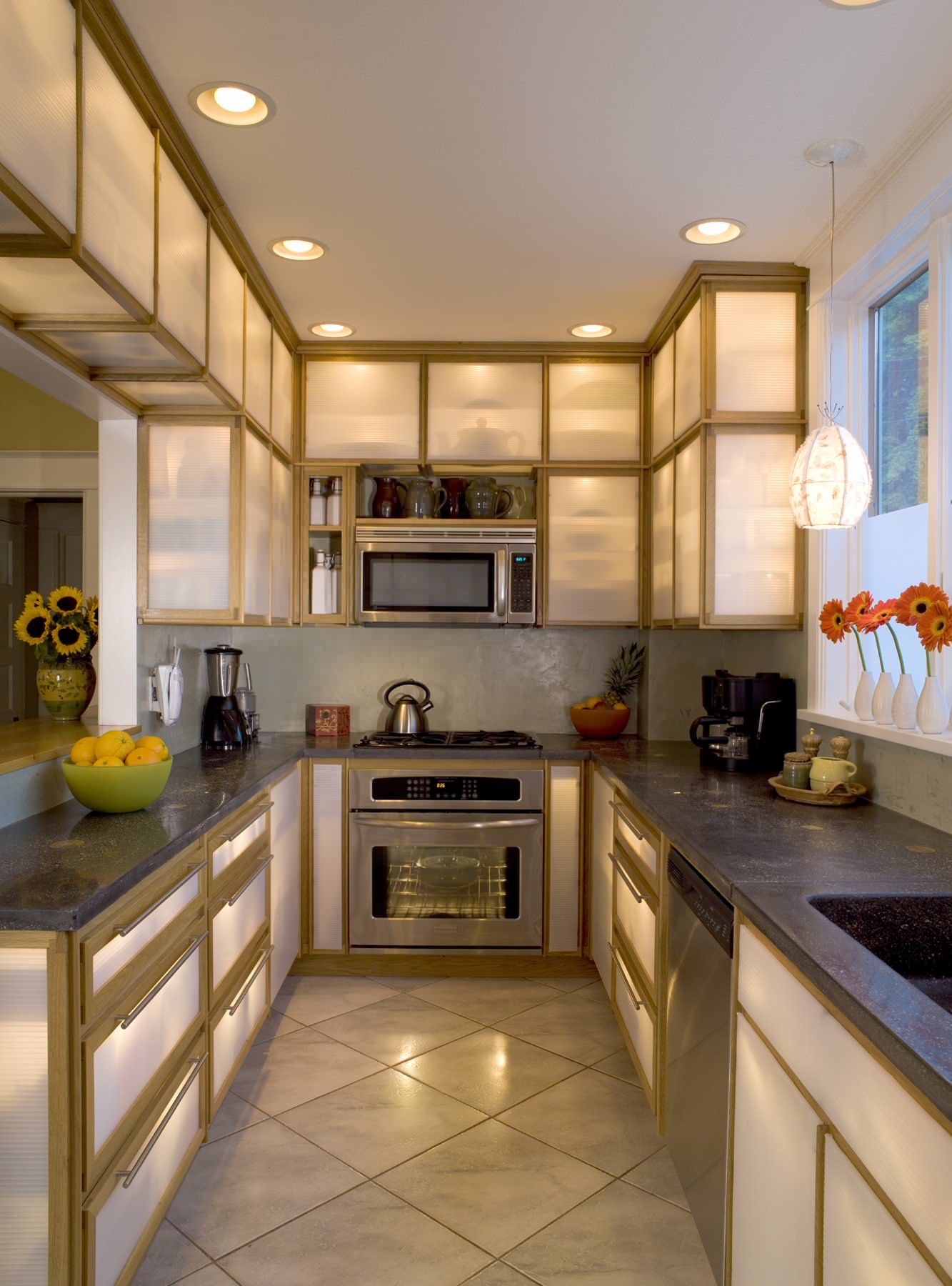 - Освещение в кухне такого типа потребует чуть больше ламп, чем при другой планировке. В некоторых кухнях буквой П дневного света вообще попадает очень мало. И чем больше рабочих поверхностей, тем больше должно быть направленного на них света. Да и барная стойка выглядит интереснее, когда над ней есть отдельная подсветка.