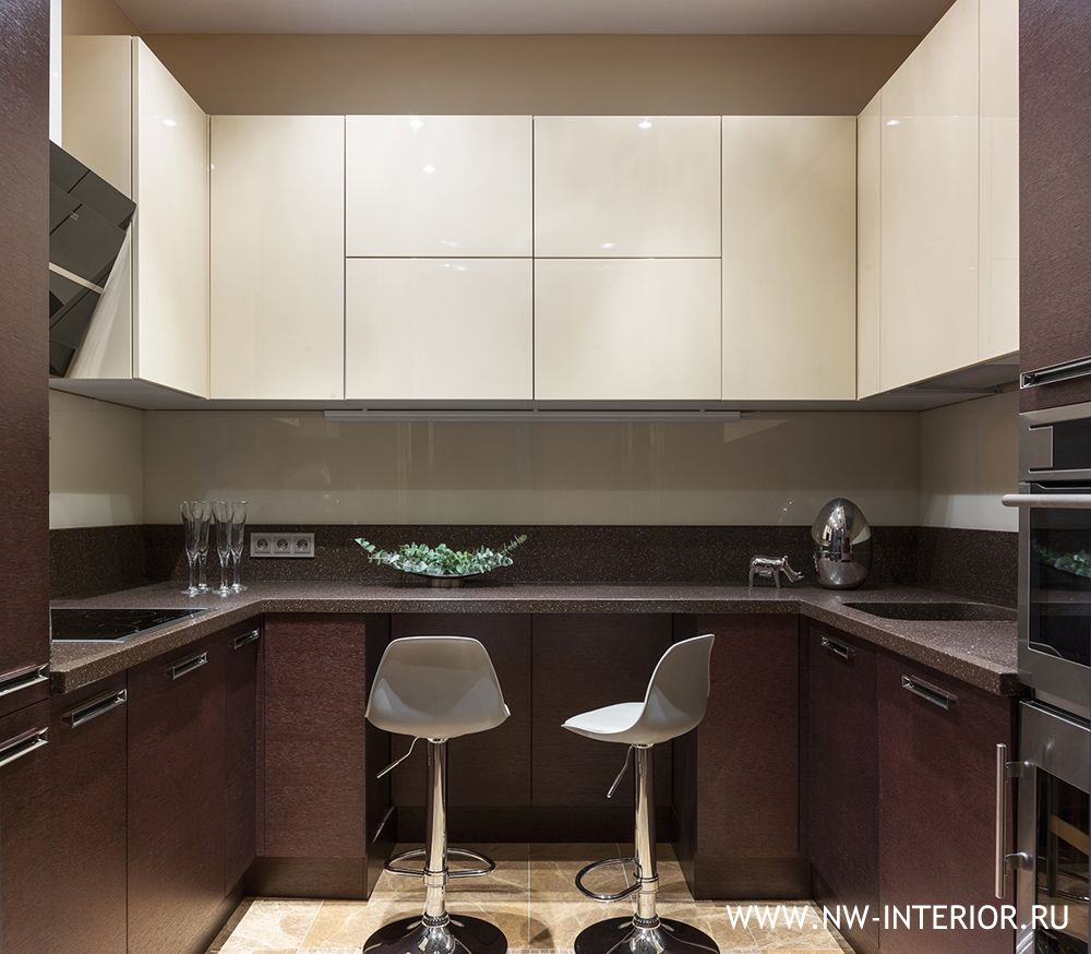 - П-образная кухня, где одну из сторон представляет собой полуостров рабочей поверхности, служащий одновременно барной стойкой.