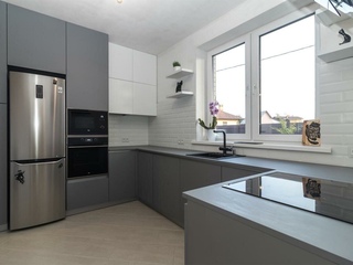 - Чтобы кухня не выглядела громоздко за счет большого количества шкафчиков, замените верхние фасады полностью или частично на закрытые или открытые полки. Так интерьер будет выглядеть более легким.