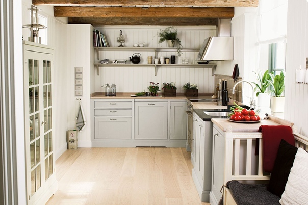 При этом кухонная мебель должна быть минимально обработана – допускается ее обжиг, грубая шлифовка, а также браширование (обработка жесткой щеткой). В отделке кухни в стиле кантри можно использовать деревянные панели, натуральный и искусственный камень. - Скандинавские кухни на даче представляют собой, по большому счету, «окультуренные кухни кантри». В отличие от предыдущего варианта используется тщательно обработанное натуральное дерево, иногда – выкрашенное белой краской. Одной из ключевых особенностей кухонь в скандинавском стиле является минимальное число текстиля и аксессуаров.