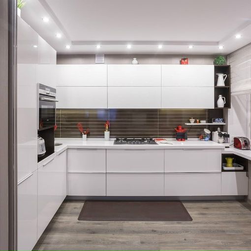 Это всегда порядок, встроенная техника, глянцевые поверхности, которые расширяют пространство. Этот стиль будет хорош и в большой, и в маленькой кухне.