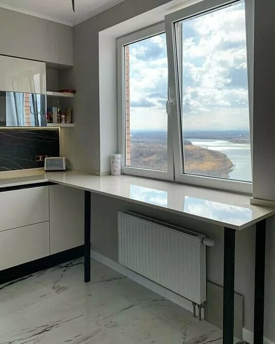 При переделке подоконника под столешницу учитывайте наличие радиатора отопления под ним. Чтобы поверхность не мешала движению нагретого воздуха, в ней придется прорезать дополнительные отверстия, для эстетичности закрыв их декоративными решетками. Саму же столешницу удобнее будет совместить с остальной рабочей зоной, придав ей Г-образную форму.