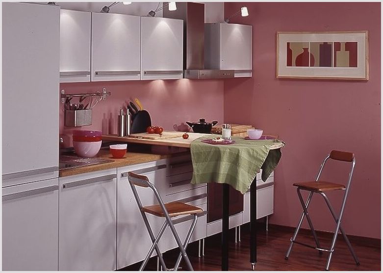 Складная барная стойка. Если в жилом помещении с маленькой кухней проживает многочисленная семья, то именно складная (раскладная) барная стойка станет оптимальным вариантом. В собранном состоянии такая конструкция выглядит, как небольшая тумбочка, помещающаяся в любом свободном углу (у стены), и ее поверхность вполне достаточна для перекуса в течение дня или чашки утреннего кофе. Для обеда в полном составе семьи достаточно лишь быстро поднять и поставить на ножки, опущенную вниз столешницу.
