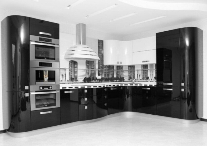 Черно белая угловая кухня