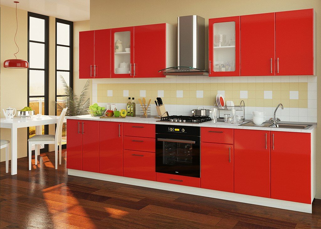 К красному гарнитуру на этом этапе нет практически никаких требований. Главное — следить, чтобы тон не выглядел дешевым на белом фоне. С красным такое часто случается.