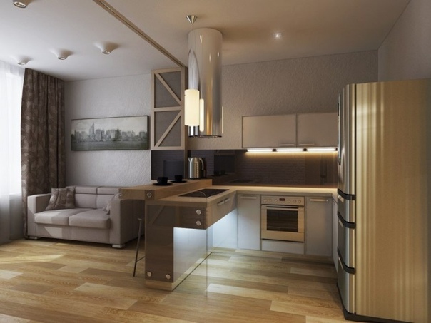 Основным недостатком таких решений является проникновение запахов, паров, звуков из рабочей зоны в область гостиной. Хотя 19 кв. метров и не такая уж маленькая площадь, выветриться без дополнительной вытяжки они не успеют, а звукам просто ничто не препятствует.