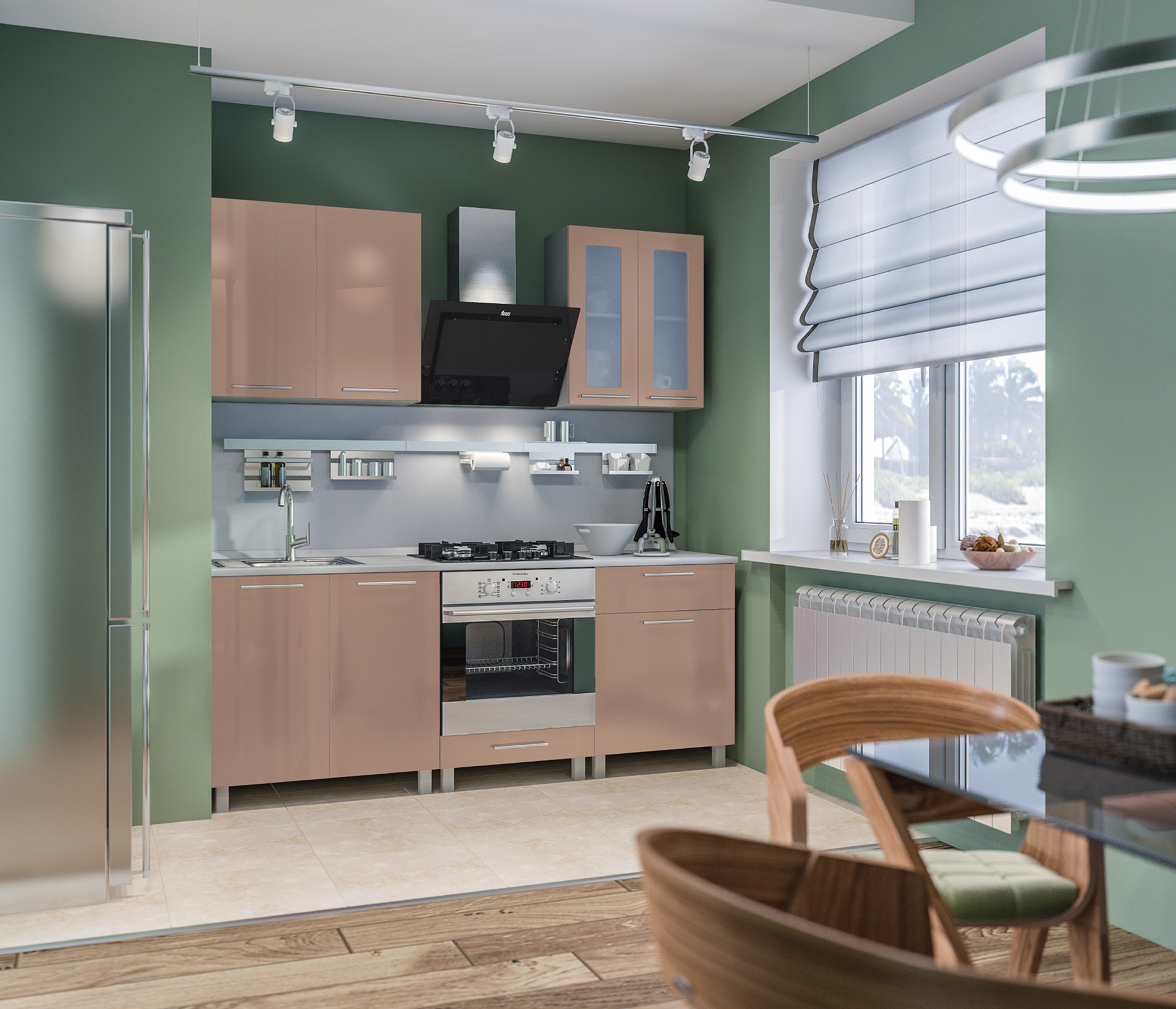 Приветствуются глянцевые кофейные фасады в один тон со стенами, можно оформить одинаково с фоном только столешницы или же только фасады верхних или нижних шкафов.