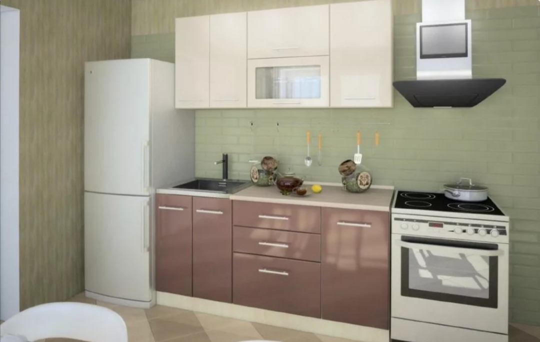 Однорядная кухня в оформлении капучино будет смотреться более элегантно, если добавить черный колорит, например, бытовую технику: холодильник, вытяжку, духовой шкаф. В сочетании с розовыми или белыми тонами гарнитур такого вида выглядит оригинальным и свежим.