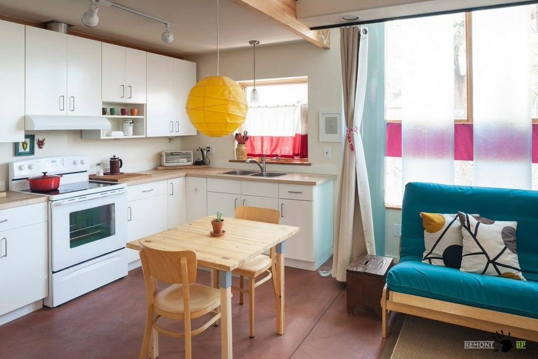 В этом случае кухонная зона может быть оборудована только необходимым минимумом – компактной плитой, холодильником, раковиной и небольшими шкафами.