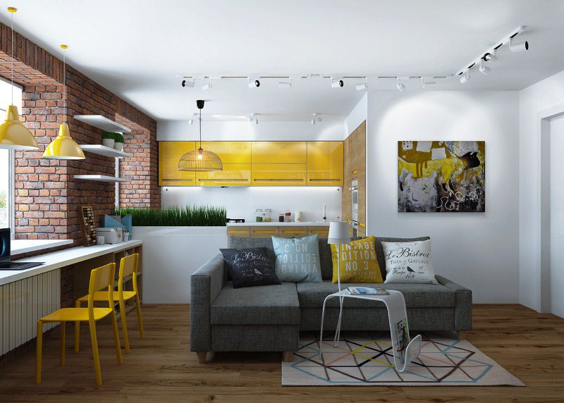 Для обустройства зоны кухни отлично подойдет небольшой гарнитур со встроенной бытовой техникой в комбинации с барной стойкой, а для гостиной — вместительный угловой диван, журнальный столик, консоль или телевизионная стенка.