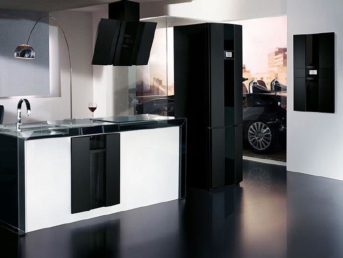 С черным холодильником отлично гармонируют предметы бытовой техники белого и стального цвета, а также прозрачные (из стекла).