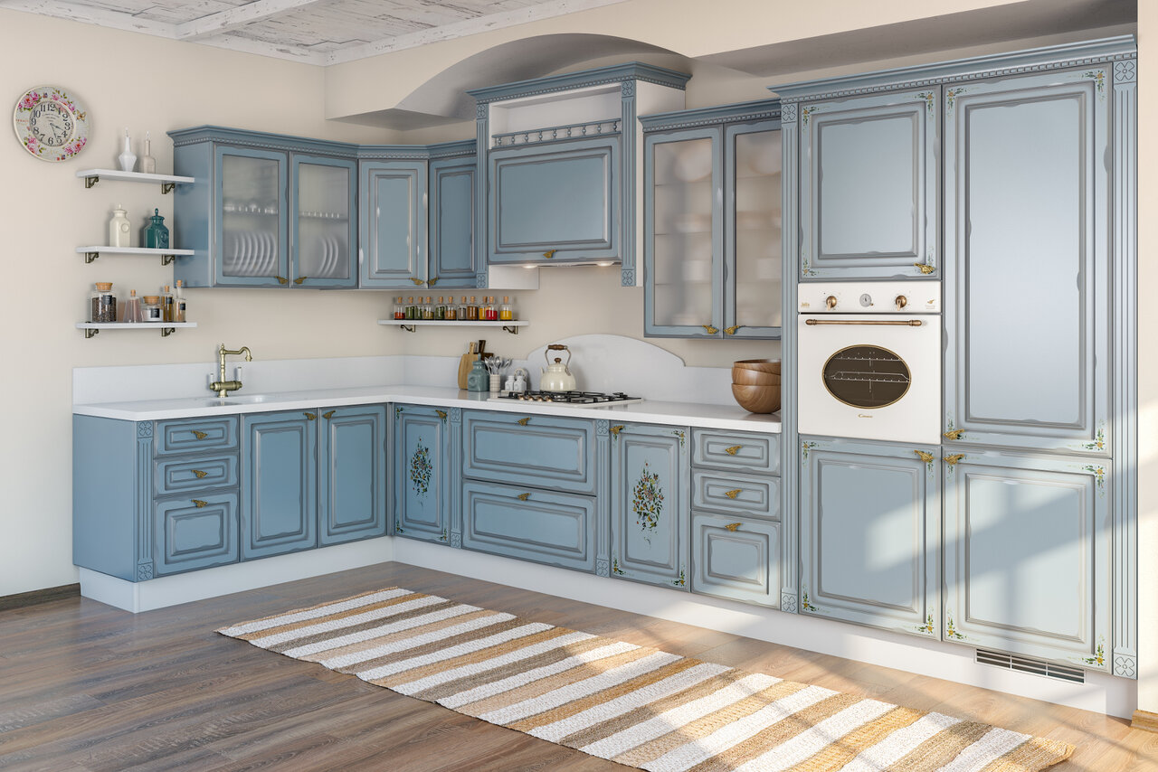 В провансе голубой может доминировать, то есть использоваться как для фасадов, так и для декора занавесок (узоры), скатертей. Если не гарнитур, то голубой оттенки можно оставить для фартука, рам окон и дверных проемов. Важно помнить, что для прованса характерны приглушенные, природные тона, например, васильковые, небесно-голубые.