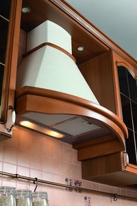 Устройство встраивают в верхний шкаф над плитой. Для маленьких кухонь это удобно и функционально, так как полезное пространство не тратится зря, плюс есть дополнительные системы хранения.