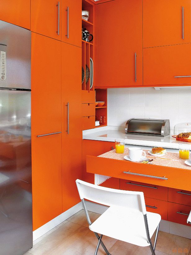 Особенно если оранжевая кухня — маленькая, или там предостаточно солнечного цвета.