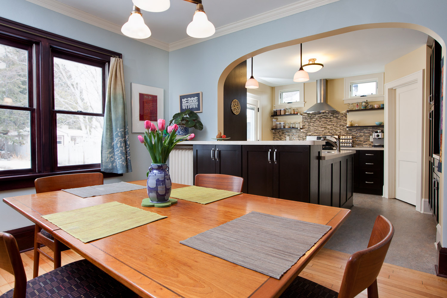 Независимо от планировки вашего дома, всегда стоит подумать о том, как вы будете перемещаться по нему. Например, обеденный стол должен находиться в пределах досягаемости от кухни, чтобы вам не приходилось пересекать гостиную с горячей едой или грязной посудой.