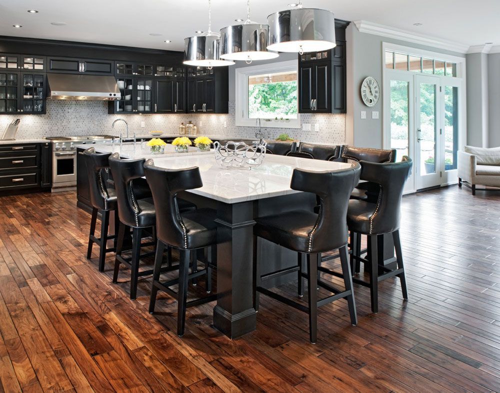 Как я уже упоминал ранее, дерево часто является лучшим вариантом для острова обеденного стола, поскольку оно может приятно контрастировать с другими материалами и хорошо сочетается как с современным, так и с традиционным стилем. Выбор обеденных стульев, которые сочетаются по цвету с мебелью, помогает связать две области вместе, поскольку темно-угольный черный цвет этих стульев Eames имитирует мягкий блеск мебели.